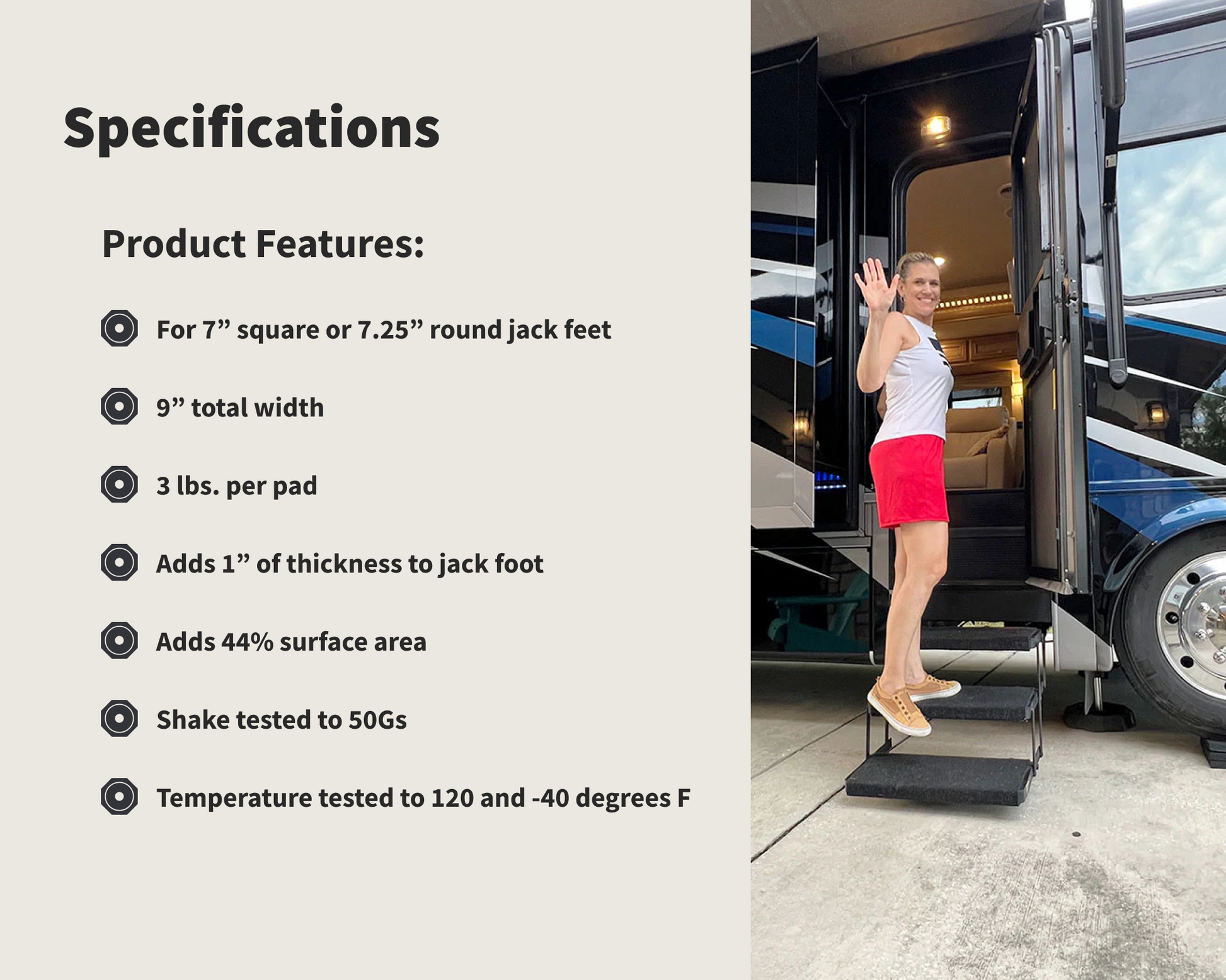 The EQ Compact four-pack is the perfect combination of efficiency and precision. Our product was crafted in collaboration with Equalizer systems to guarantee a precise fit. This package includes SnapPads that easily and permanently hook onto Equalizer’s 7” square and BAL’s 7.25” round landing feet, ideal for Class B and C Motorhomes and Travel Trailers. Installation is a breeze; just snap them on and never think about jack pads again!