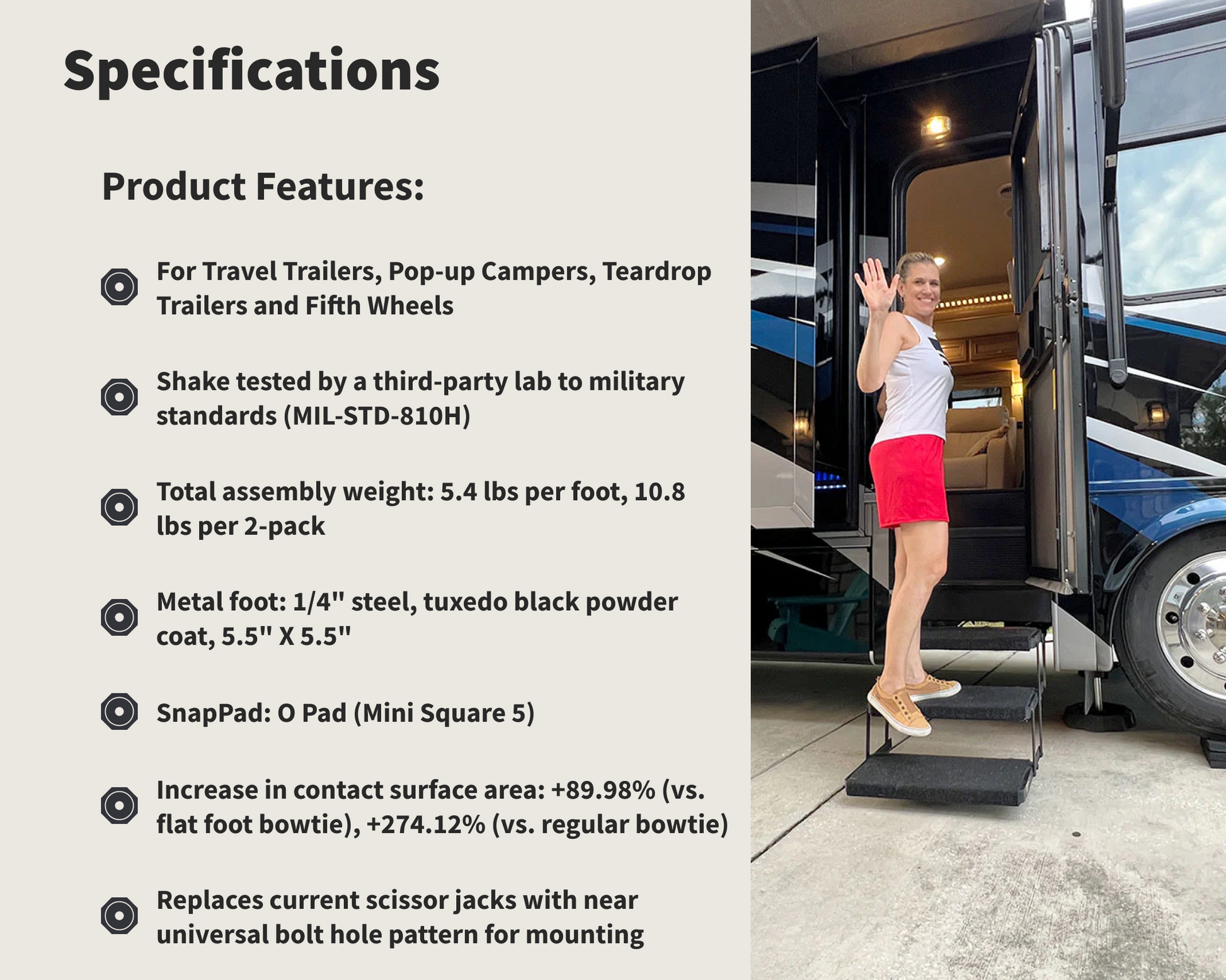 This isn't just a facelift for your RV's feet—it's a total foot wardrobe makeover. We're talking a custom metal foot that's slicker than your favorite leather jacket, a pre-loaded SnapPad for that "ooh la la" effect, and every little widget and doodad you need to revamp your rig. It's like turning your scissor jack into James Bond—complete with the fancy shoes